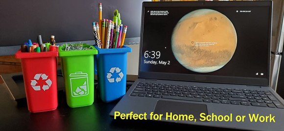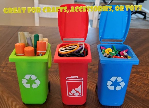 Mini recycling bin/garbage can replicas that are great for a variety of uses. Desk organization, storage for small supplies, or even as an actual trash/recycling receptacle for kitchen scraps, pencil shavings, candy wrappers, etc.