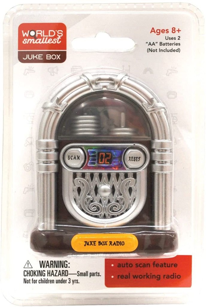 This tiny jukebox, from our pals at Westminster, is a real, working radio with an auto-scan feature to easily find your favorite station. Runs off of 2 double-A batteries and can play for hours.