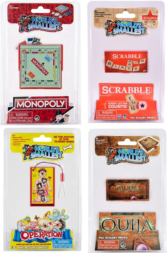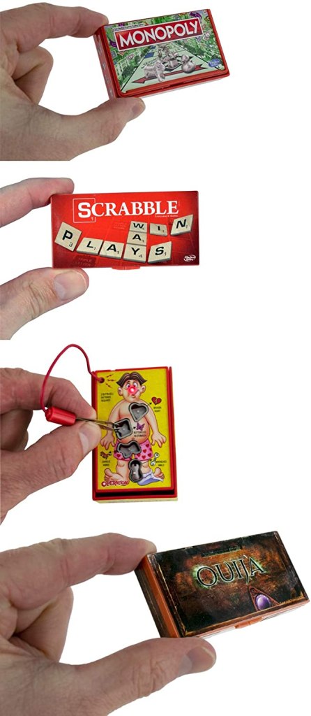 An amazing set of four teeny-tiny, but fully playable board games. Grab this set of mini Monopoly, tiny Operation, small Scrabble, and undersized Ouija–for the combined size of less than one full-sized game!