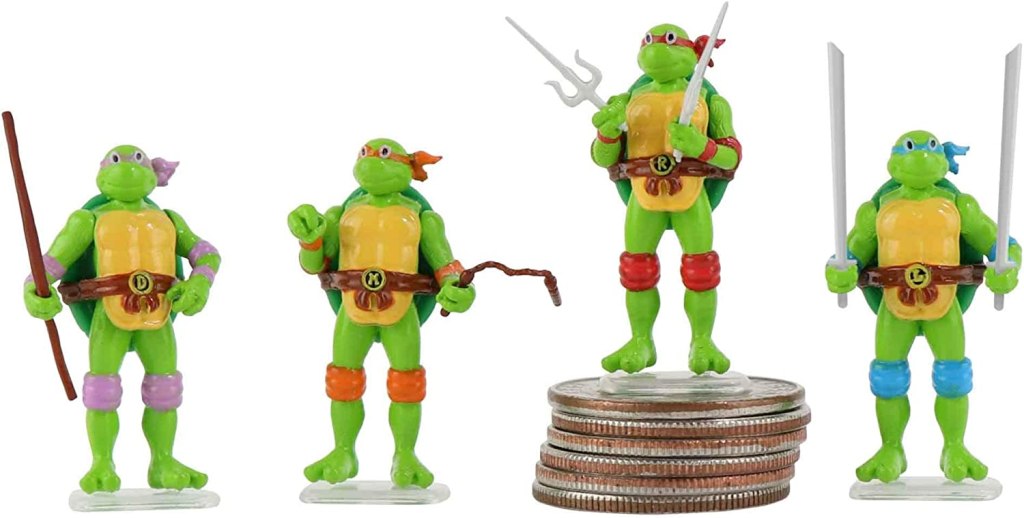 Each set includes all four of your favorite heroes in a half shell: Leonardo, Michelangelo, Donatello, and Raphael. Standing at less than 2 inches tall, these micro-sized ninjas are ready to take on the biggest adventures in the palm of your hand!