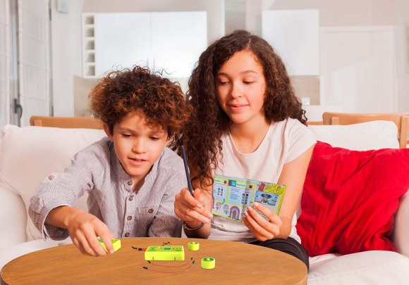 This kit contains 12 different pieces, and a big, educational fold-out complete with 20 different arrangements and activities that can be put together with the circuitry kit. Perfect for curious kids!