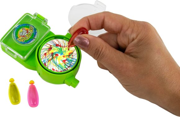 - Simply place a small paper disc onto the spinning platform, add drops of vibrant paint, close the clear lid, and push the spinner button. Watch as centrifugal force works its magic, blending colors into dynamic patterns! No batteries needed.